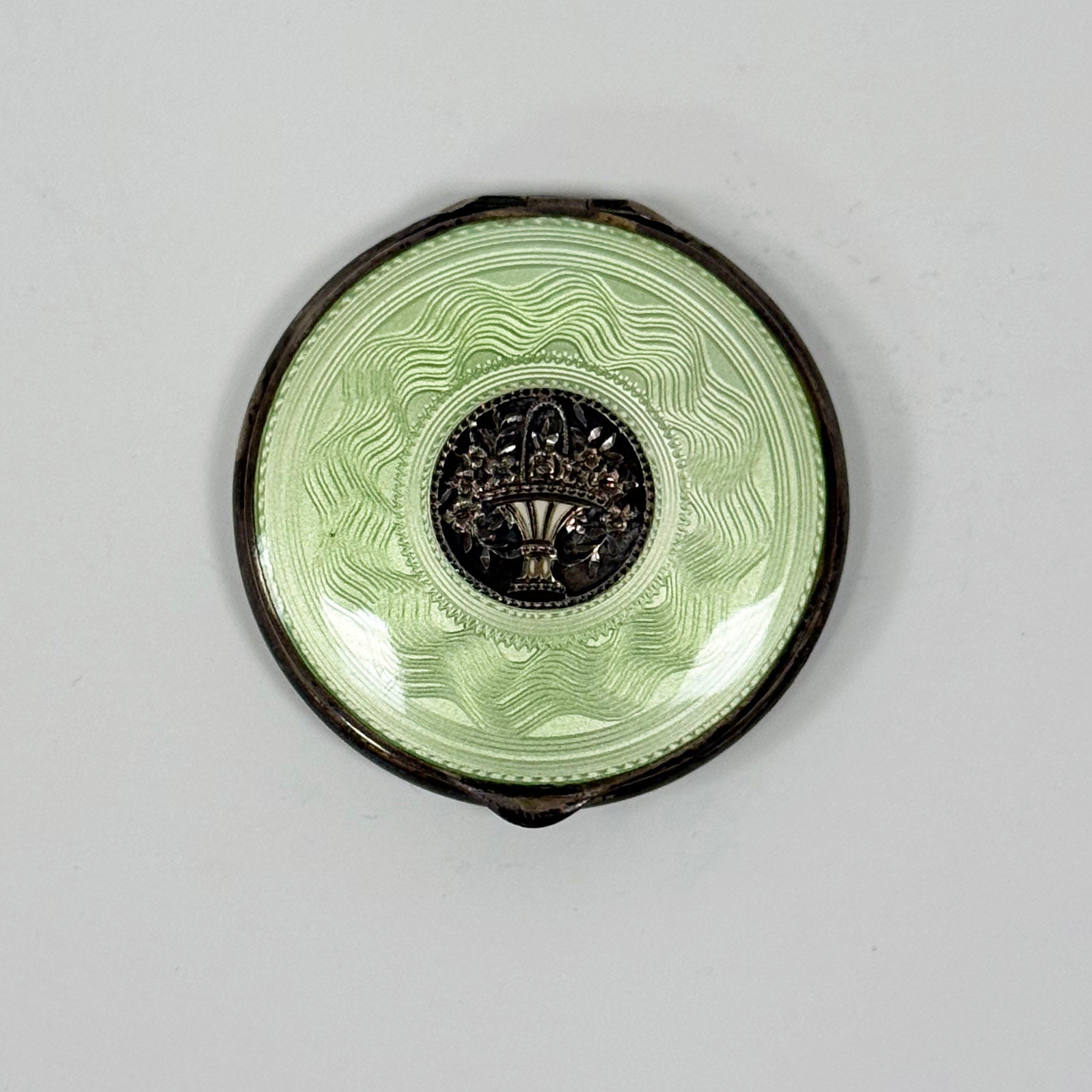 This vintage Guilloché and sterling silver compact was sourced by Julia Moss Designs.
