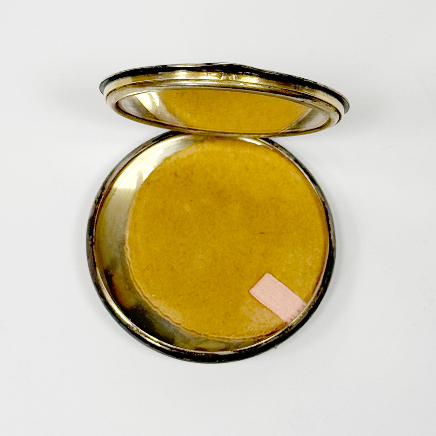 The round compact is centered with a delicate floral filigree disc