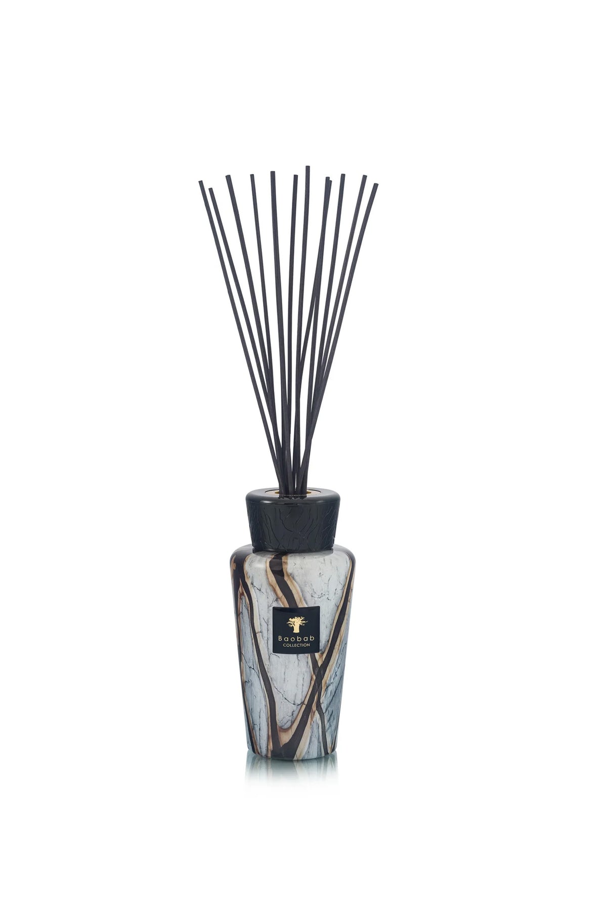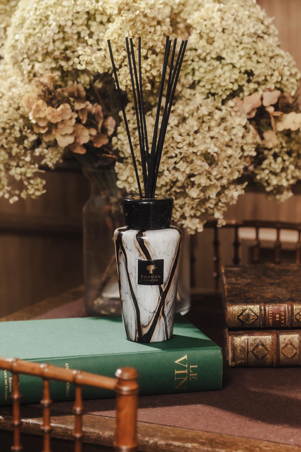 The 16.9 fl. oz | 500ml Marble perfume diffuser showcases the same sophisticated design as our larger editions. Inspired by the timeless beauty of marble, its white glass is adorned with grey and black veining edged in beige, creating the effect of a luminous stone. The glossy black cap completes the refined look, while its leather-scented fragrance adds a seductive dimension to any interior.