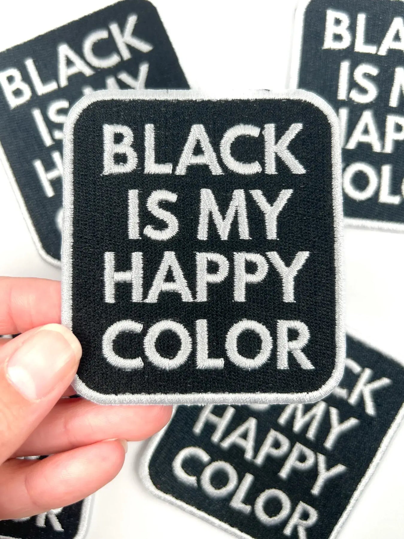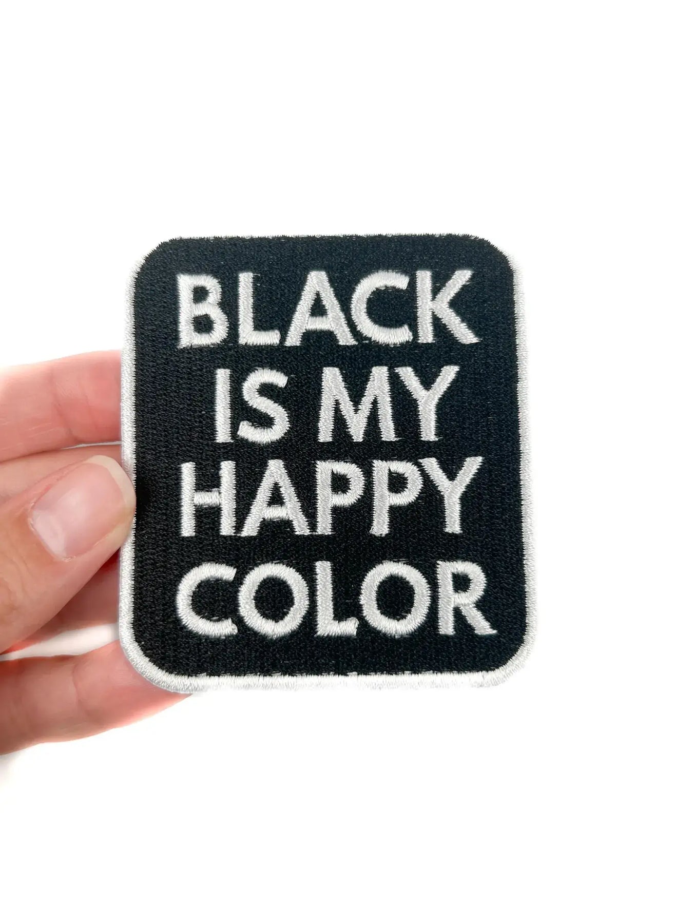 The Black Is My Happy Color embroidered patch brings humor, style, and a touch of rebellion to your wardrobe or accessories. With crisp white block lettering on a bold black background, it’s a high-contrast patch with major personality. Stick it to your jacket, tote, or backpack and let your all-black wardrobe do the talking.