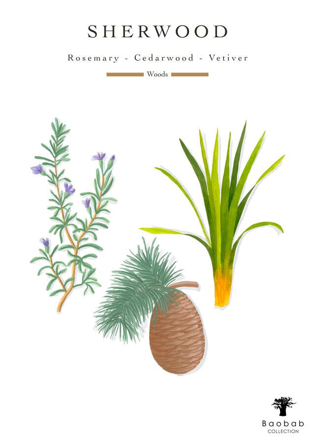 Part of the new Woods Collection from Baobab. Sherwood evokes the woody scents of rosemary, cedar wood and vetiver.