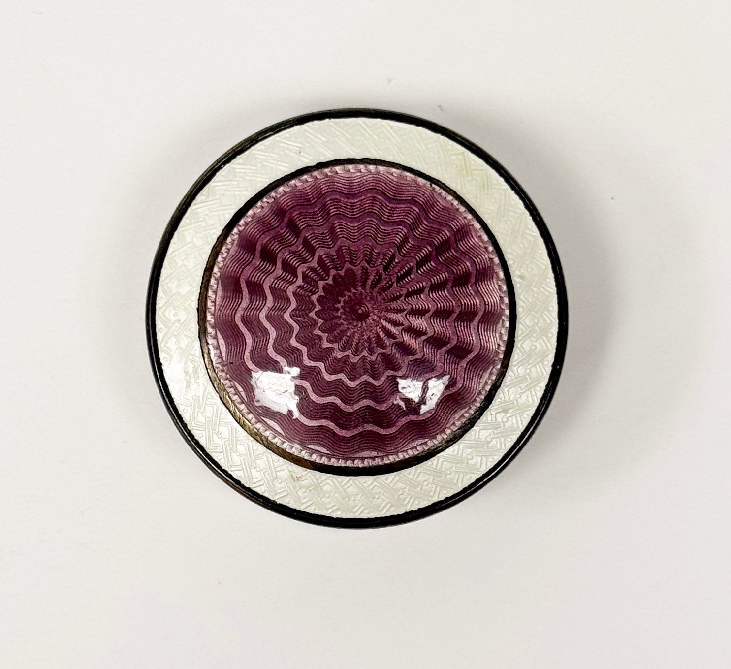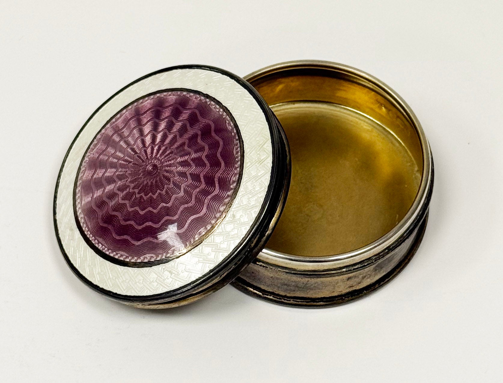 Sterling Silver container with lavender and pearl white Guilloché Enamel lid