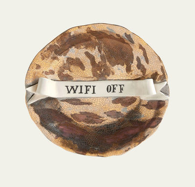 Messages like Wi Fi Off lend each plate a witty twist, capturing Ruan Hoffmann's knack for playful yet thought-provoking commentary. Each plate is unique, gilded with hand-applied gold and platinum that glows beneath a brushed layer of oil, creating a reaction that transforms the metallic sheen into something one-of-a-kind. This piece is a perfect balance of artistry and humor, making it an unforgettable element in the L'OBJET Ruan Hoffmann collection.